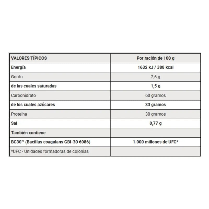 Ingredientes: Mezcla de carbohidratos (56%) (maltodextrina, fructosa), concentrado de proteína de suero (38%) (contiene emulsionante: lecitinas), azúcar, saborizante, sal, espesante (goma xantana), colorante (rojo de remolacha), acidulante (ácido cítrico), BC30™ (Bacillus coagulans GBI-30 6086).